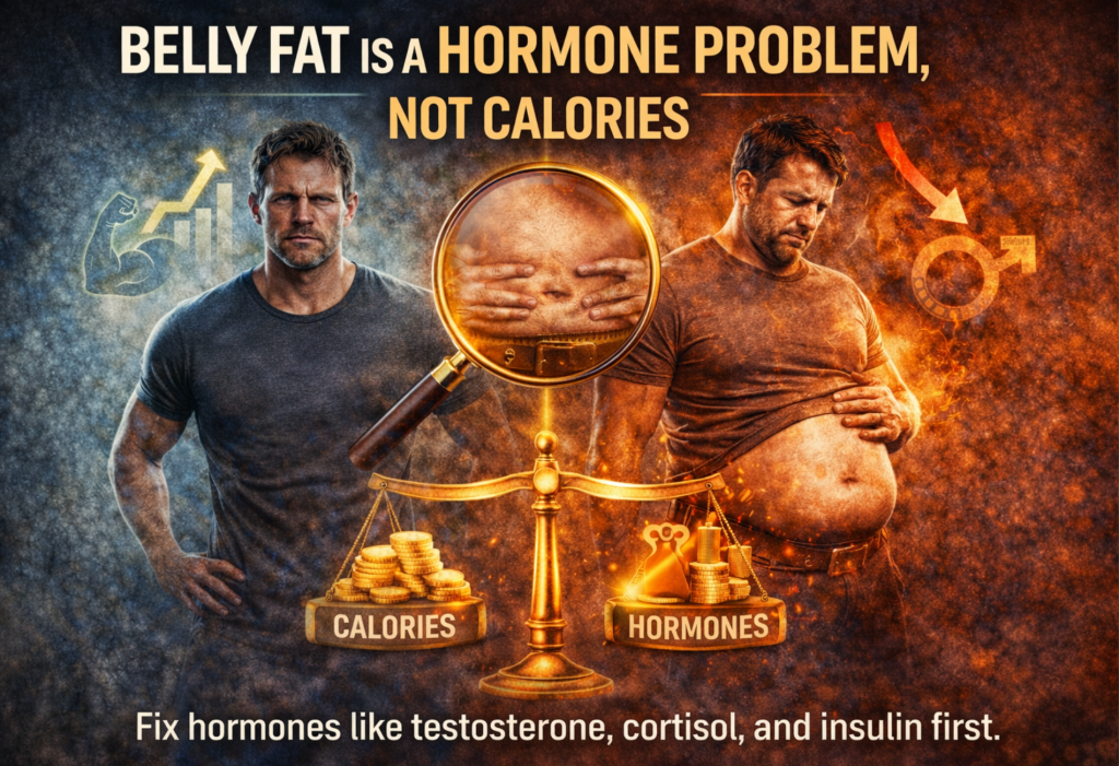 Men cut calories, run more, eat “clean,” and still can’t lose belly fat. That’s not a discipline failure, it’s biology working against them.